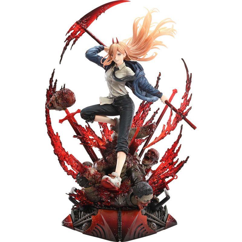 At a bloody 26 inches tall, Power lands atop a pile of puny devil corpses in this jaw-dropping statue; splashing and bursting with personality and commanding presence, she’s seen showcasing her mind-bending blood manipulation ability, allowing her to freely manipulate the blood in her body to form weapons. The blood-stained Public Safety uniform features her typical shoulder-dropped fashion, as she is often seen wearing in the series – giving her an untidy, half-dressed appearance that pairs well with her nonchalant demeanor. This meticulously crafted statue perfectly captures every detail of Power’s fearlessness and superiority, from her gracious blood scythe that she graciously wields behind her back, to the intense yet gentle gaze of her cross-patterned eyes. Every curve and contour of the body and sculpted hair strands speaks volumes to the devotion and talent of our artists, making this statue a true testament to her iconic role in the series.