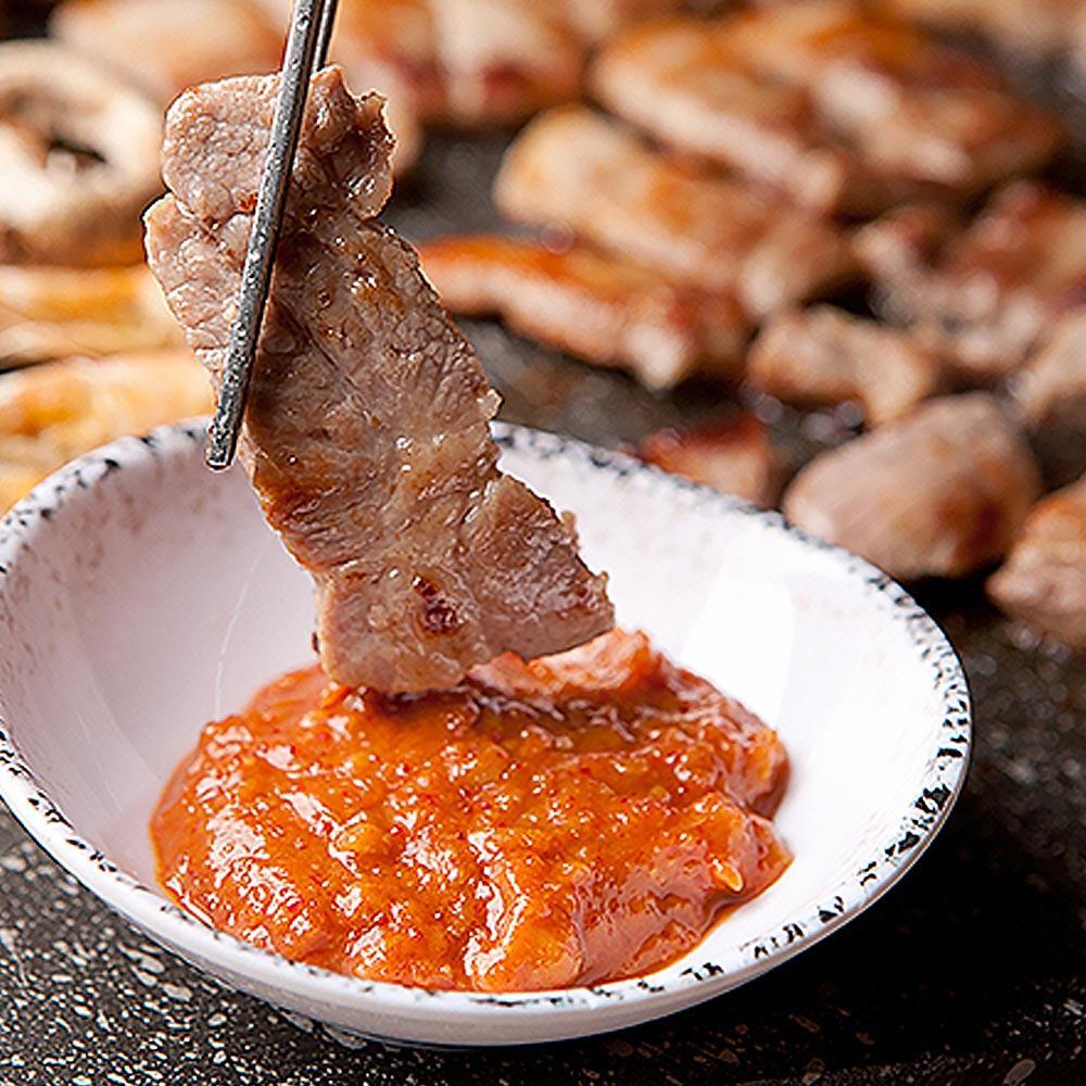 Ssamjang soy paste is a traditional Korean bean paste supplemented with garlic and chilli powder. The base for this paste is the Doenjang fermented bean paste, supplemented with Gochujang (Korean chilli paste) and other flavourings such as garlic. You use this paste mainly at Korean BBQ as a flavouring for meat or as a dip for meat or vegetables.