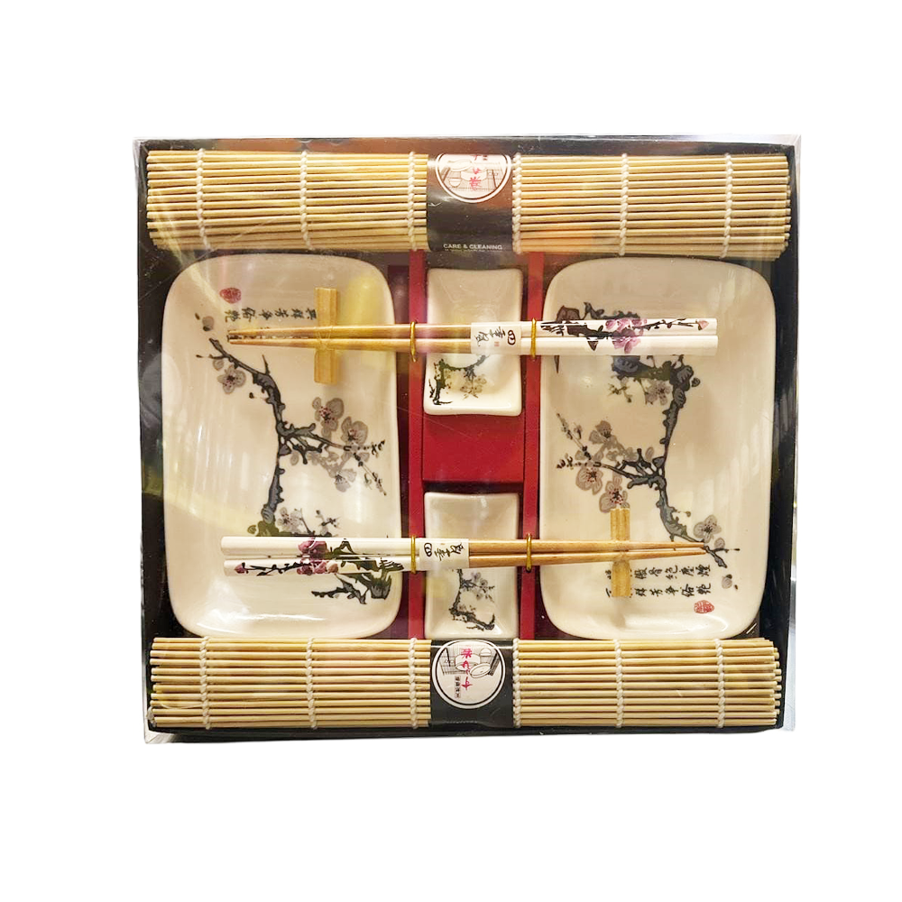 The sushi set includes: 2 ceramic sauce saucers 7×5 cm, 2 ceramic plates 18×11 cm, 2 bamboo mats 30×45 cm, 2 pairs of bamboo chopsticks, 2 bamboo stands for chopsticks.