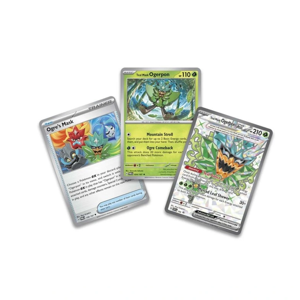 A legendás Pokémon Ogerpon egy csodálatra méltó, de ádáz erő, amivel számolni kell, és a Terastallizing még nagyobb magasságokba emeli erejét! Ezzel a kollekcióval Teal Mask Ogerpon Tera Pokémon exként csaphatsz össze, csatlakozva Teal Mask Ogerpon egy másik változatához és egy Ogre’s Mask Trainer kártyához, mint különleges fóliakártyákhoz. Egy kártyavédő, egy kártyahüvelykészlet és egy halom booster teszi még édesebbé új barátságodat Ogerpon-nal!